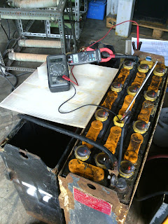 充電前數據:總電壓~49.5V,2.07V~2.08V/cell,比重1.225-1.235,溫度34.5度C,補水約12公升,一併做漏液測試,1840自動充電。
